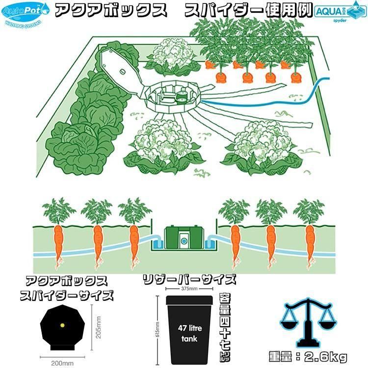 セット内容 | 47Lリザーバーとフタ、アクアバルブ5、アクアボックススパイダーボディ、9mmトップハットグロメット×2、9mmT字コネクタ、円形水準器、16-9mmクリックフィットアダプター&フィルター、9mmゴルフフィルター、9mmインラインタップ、9mmパイプ(2m)、キャピラリーマット(6m)、取扱説明書